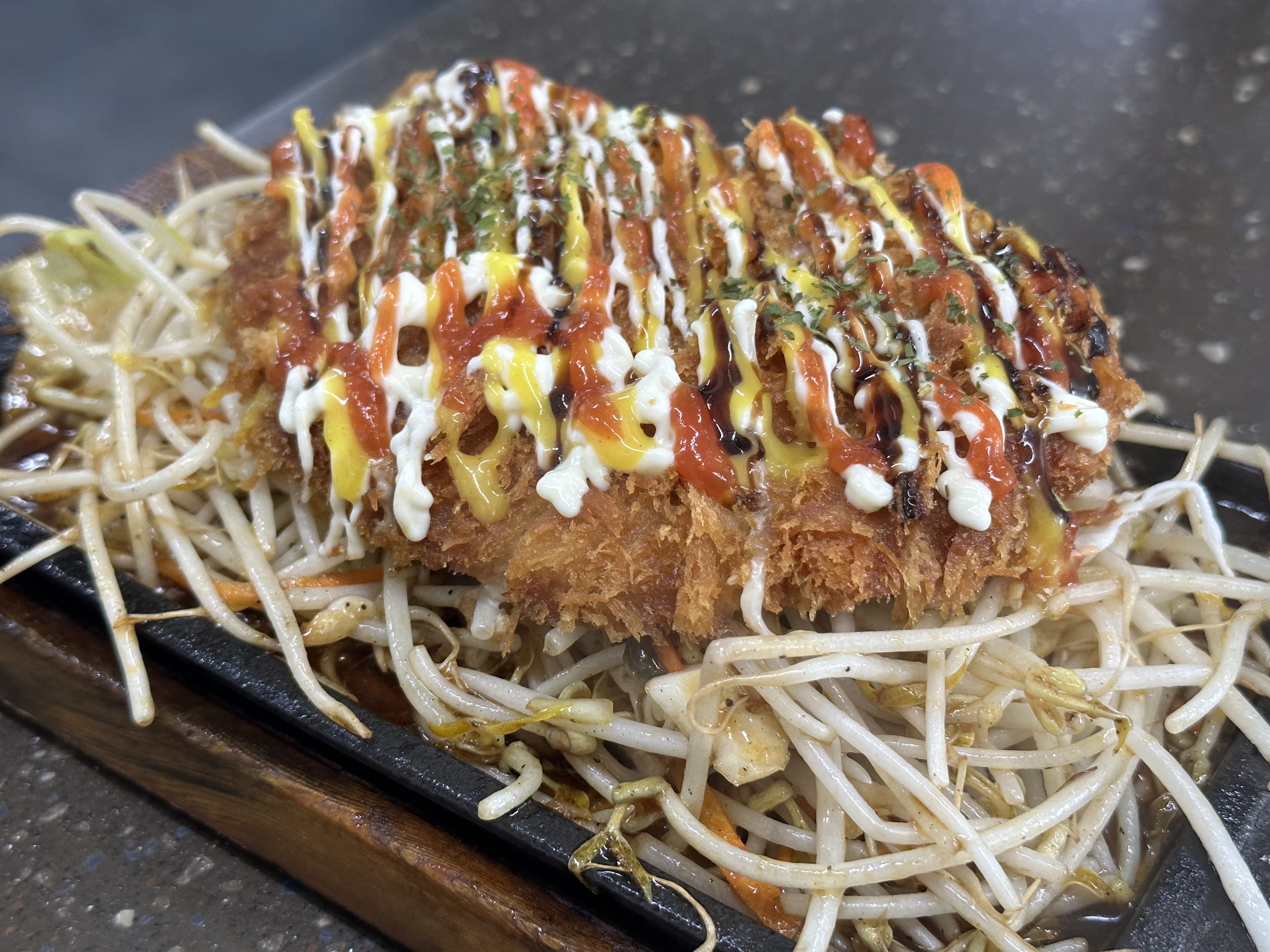 숙주가 한가득 철판 위에 놓여있고, 그 위로 치즈돈까스가 올라가 있다.