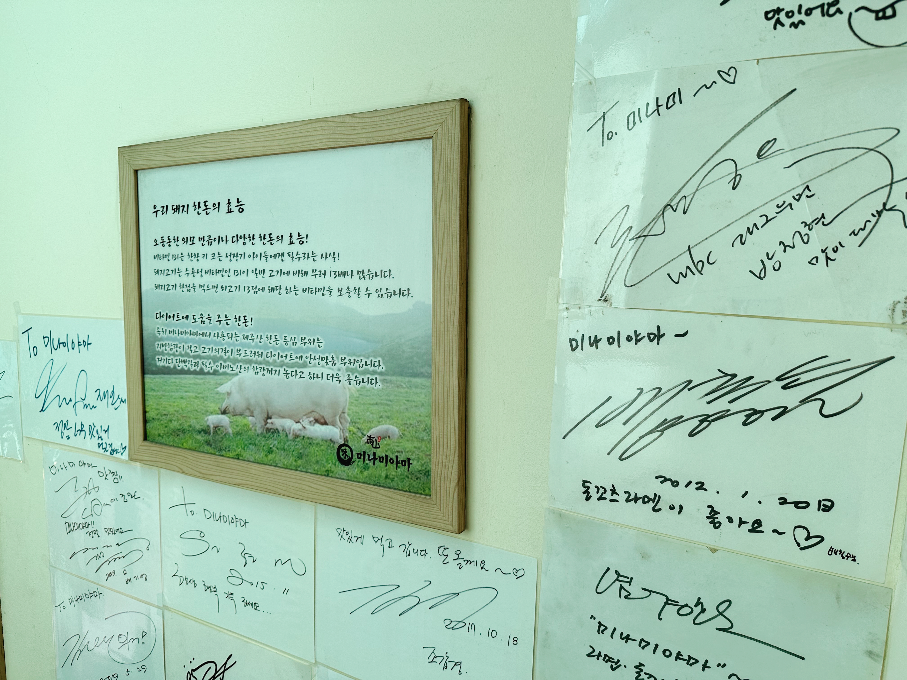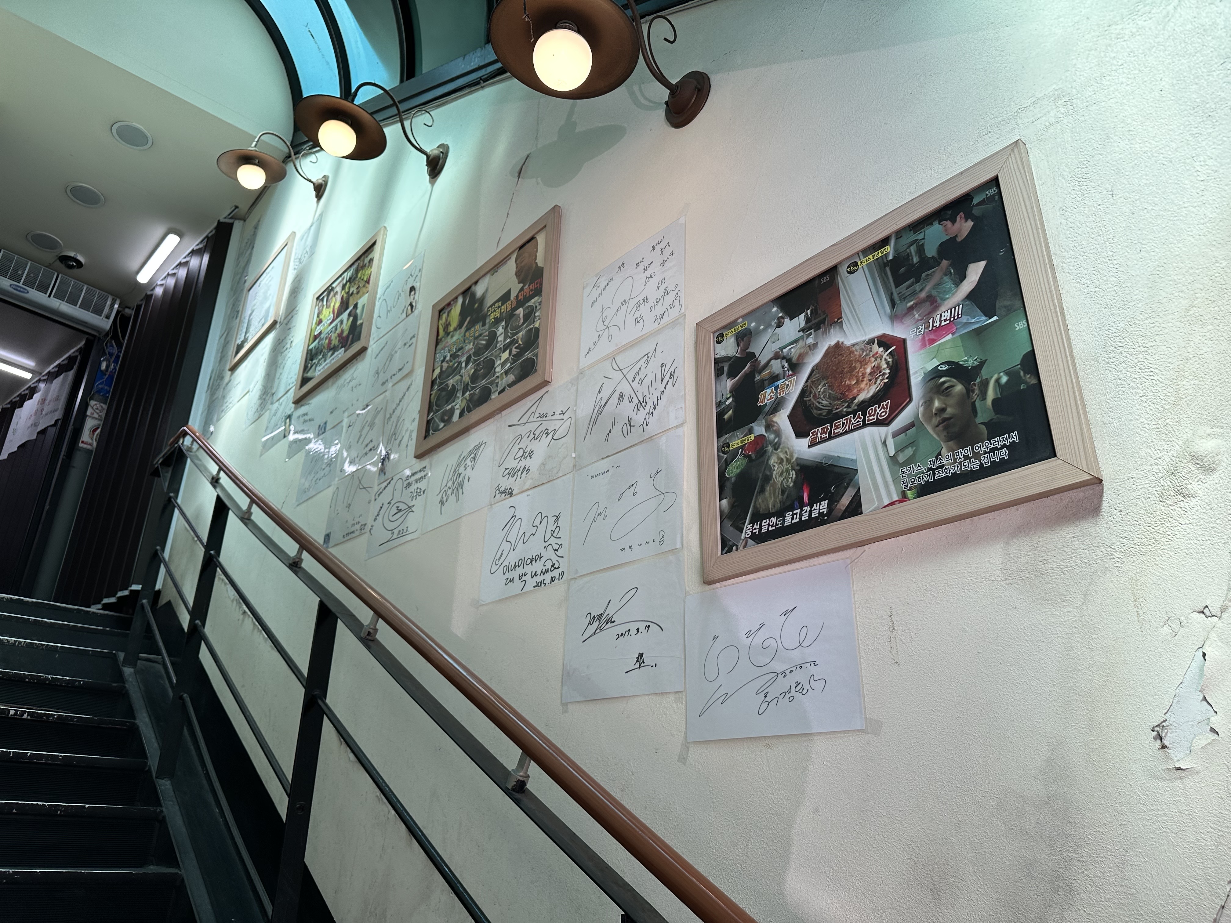 맛집 인증이라도 하듯이 올라가는 계단 양 옆의 벽면에 연예인 사인으로 가득했다.