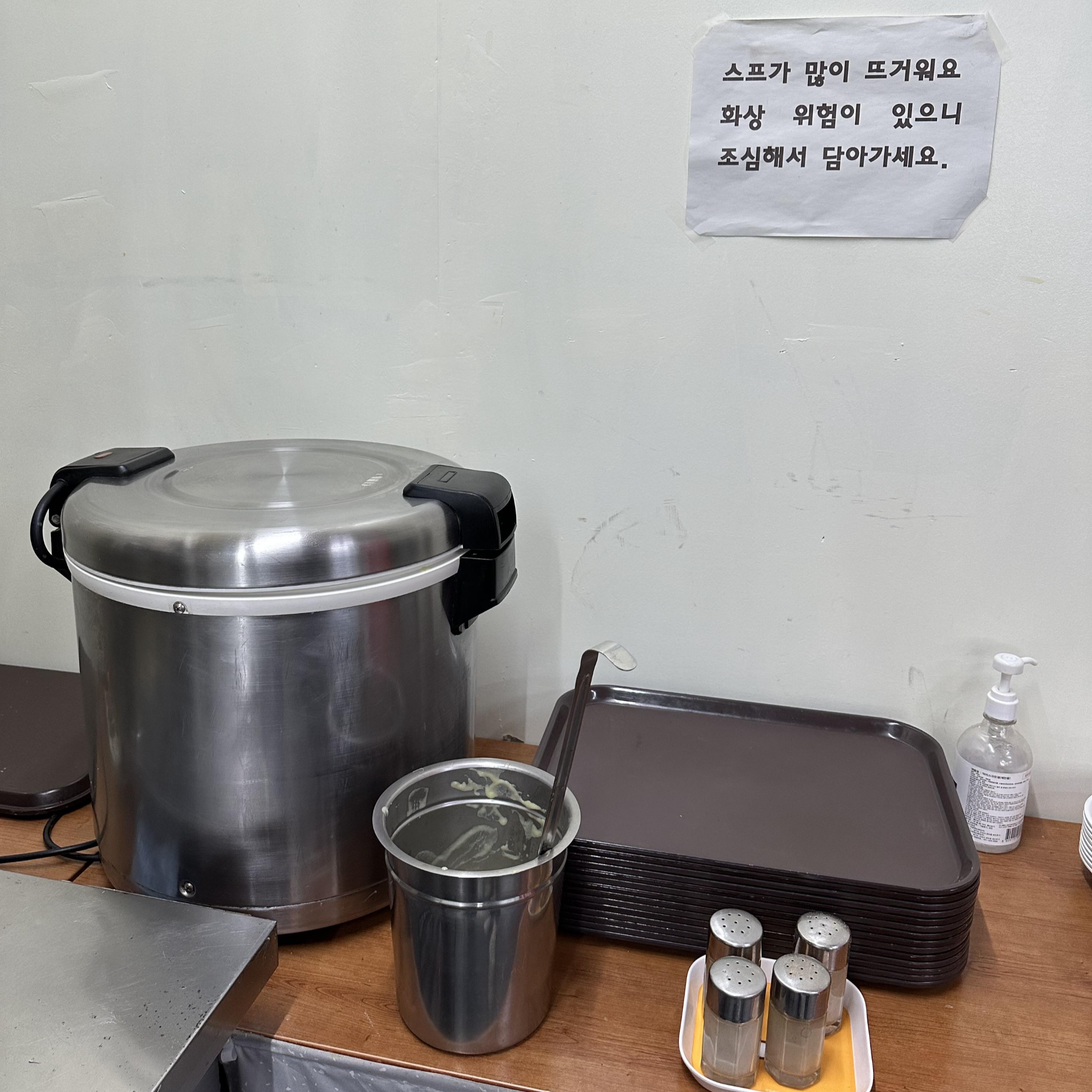 대형 밥솥 안에 담겨있는 스프를 준비된 국자로 담고, 후추를 뿌려서 가져가면 된다.