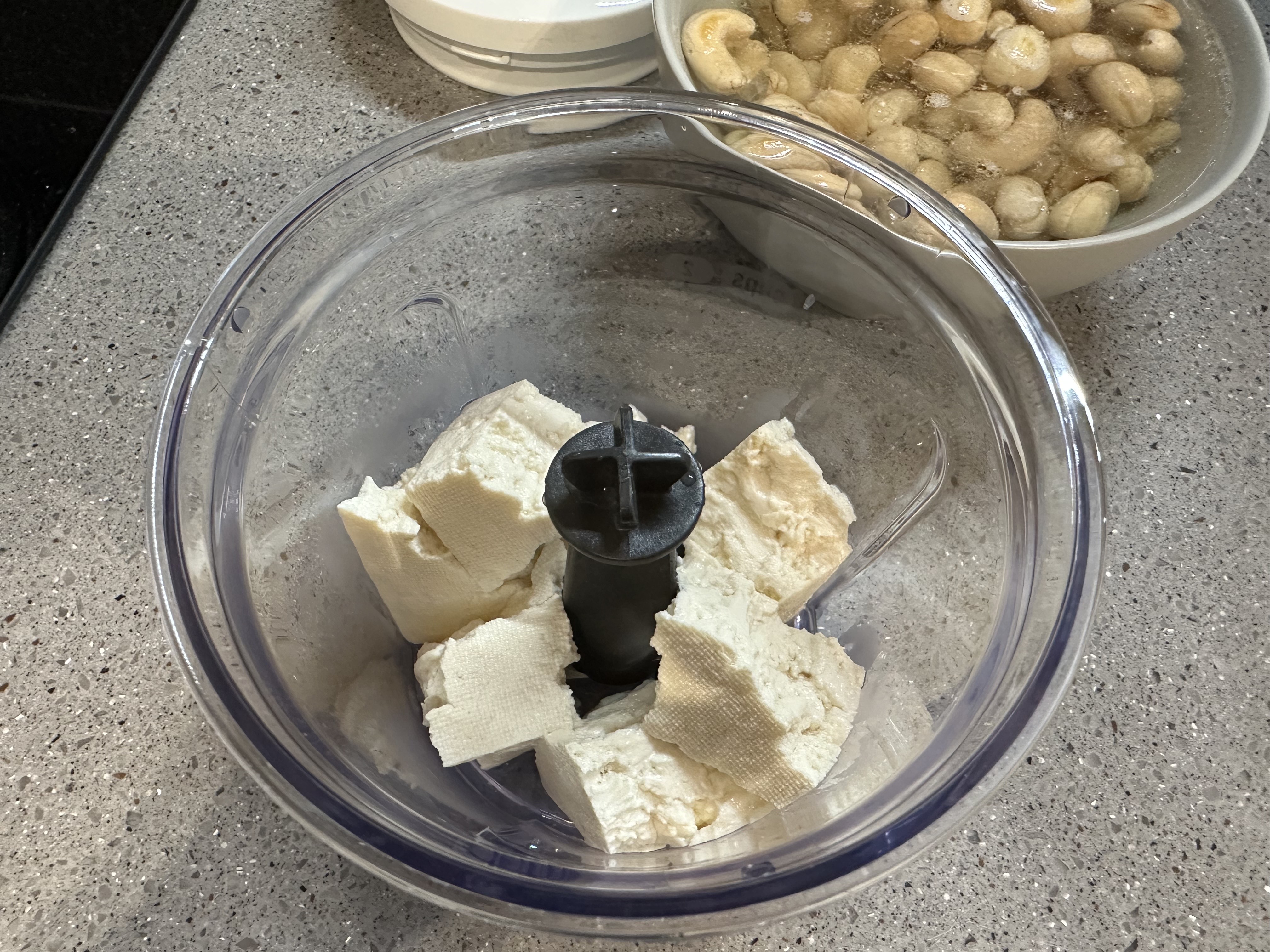 믹서기에 불린 캐슈넛을 두부와 함께 넣어준다.