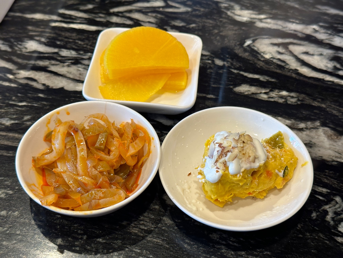 단무지, 짜사이, 단호박 샐러드가 기본찬으로 나왔는데, 단호박 샐러드가 애피타이저로 먹기 참 좋았다.