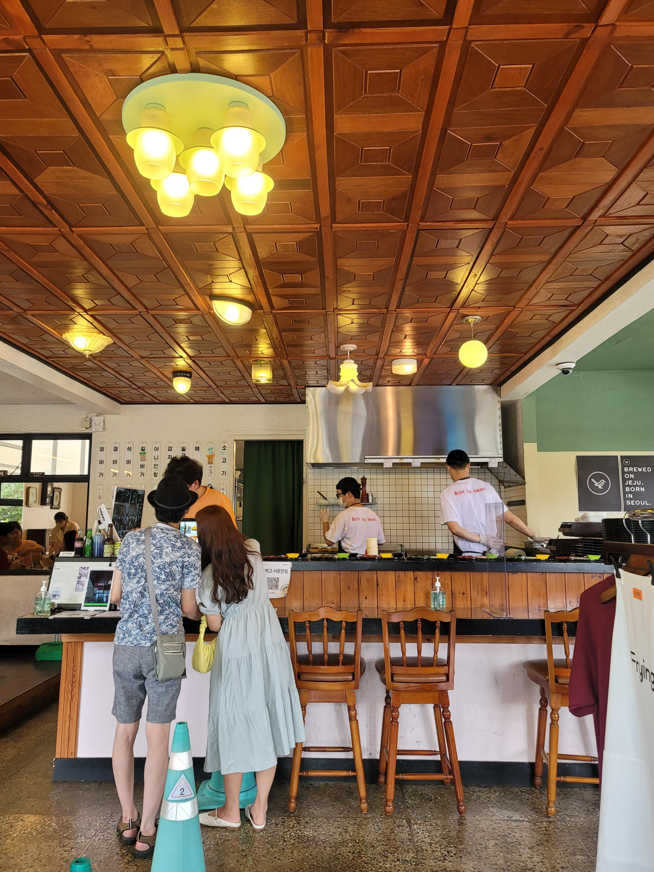 지금은 단가가 꽤 나갈 것으로 예상되는 천장의 목재 마감과 정면으로 보이는 바(bar) 형태의 테이블과 꽤나 앤틱한 감성이 묻어나는 의자,